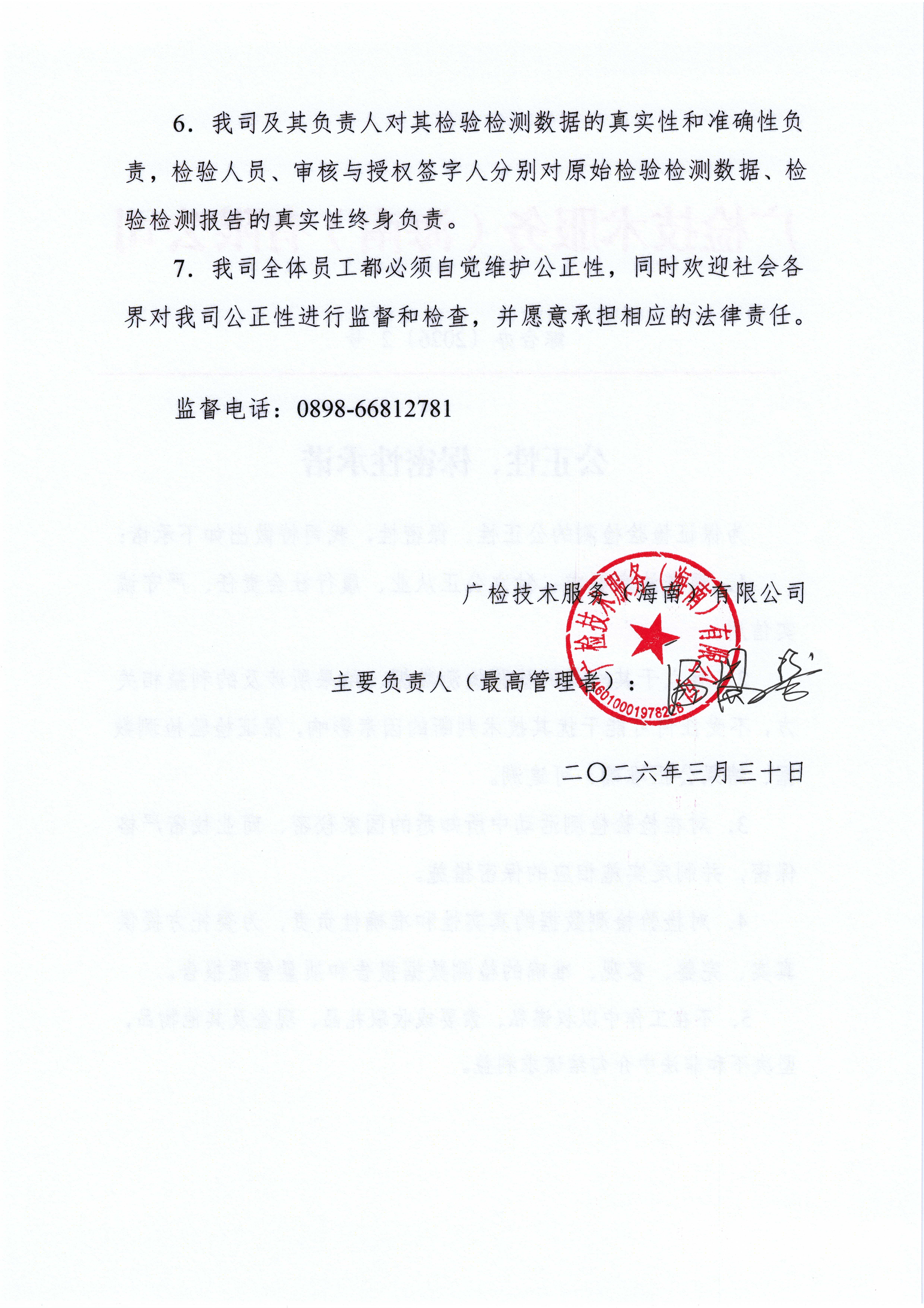 6.我司及其负责人对其检验检测数据的真实性和准确性负责,检验人员、审核与授权签字人分别对原始检验检测数据、检验检测报告的真实性终身负责。