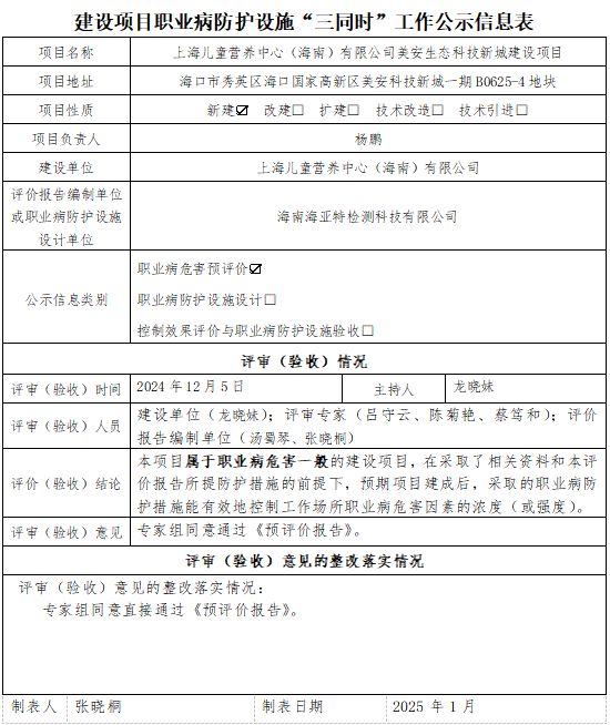 上海儿童营养中心(海南)有限公司美安生态科技新城建设项目职业病防护设施“三同时”-职业病危害预评价信息公示