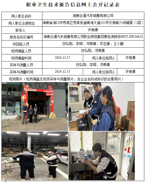 海南合通汽车销售有限公司2024年职业卫生定期检测