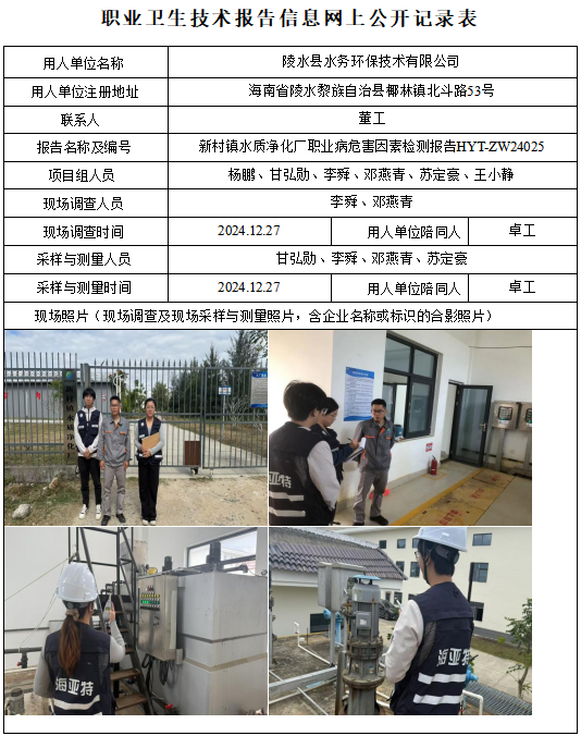 陵水县水务环保技术有限公司新村污水处理厂2024年职业卫生定期检测