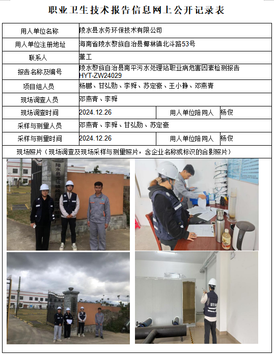陵水县水务环保技术有限公司南平污水处理厂2024年职业卫生定期检测