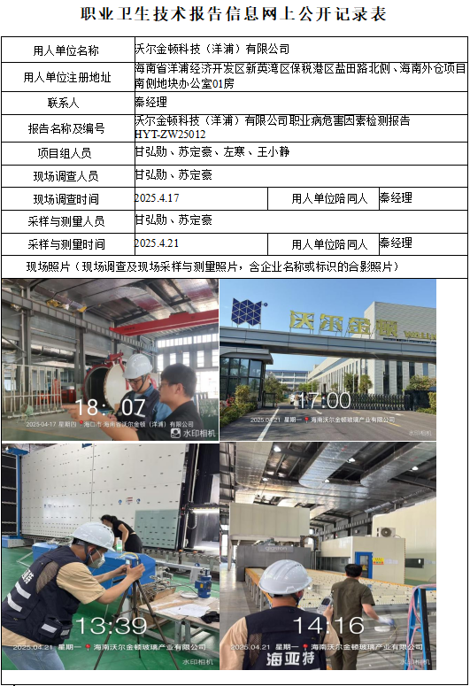 沃尔金顿科技(洋浦)有限公司2025年职业病危害因素定期检测