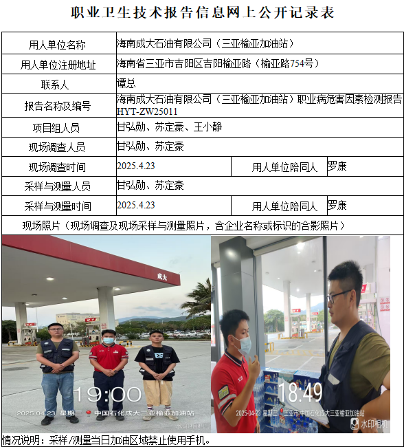海南成大石油有限公司(三亚榆亚加油站)2025年职业病危害因素定期检测