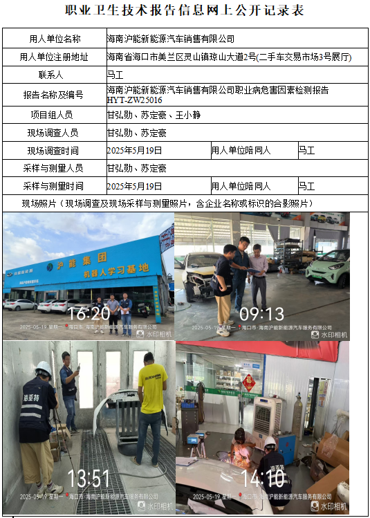 海南沪能新能源汽车销售有限公司2025年职业病危害因素定期检