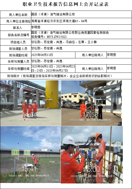 国投(洋浦)油气储运有限公司2025年职业病危害因素定期检测