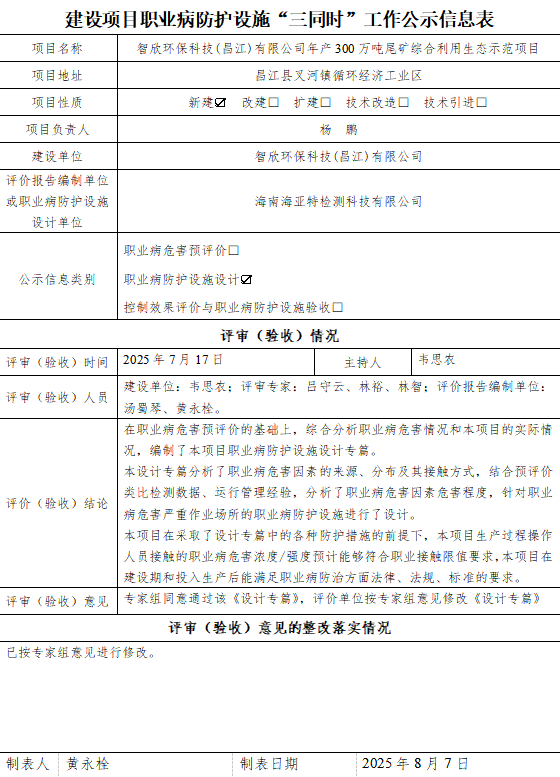 智欣环保科技(昌江)有限公司年产300万吨尾矿综合利用生态示范项目-职业病防护设施“三同时”-设计专篇报告公示信息