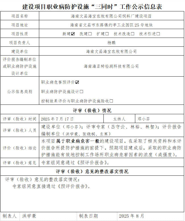 海南文昌海宝农牧有限公司饲料厂建设项目-职业病防护设施“三同时”-预评价报告公示信息