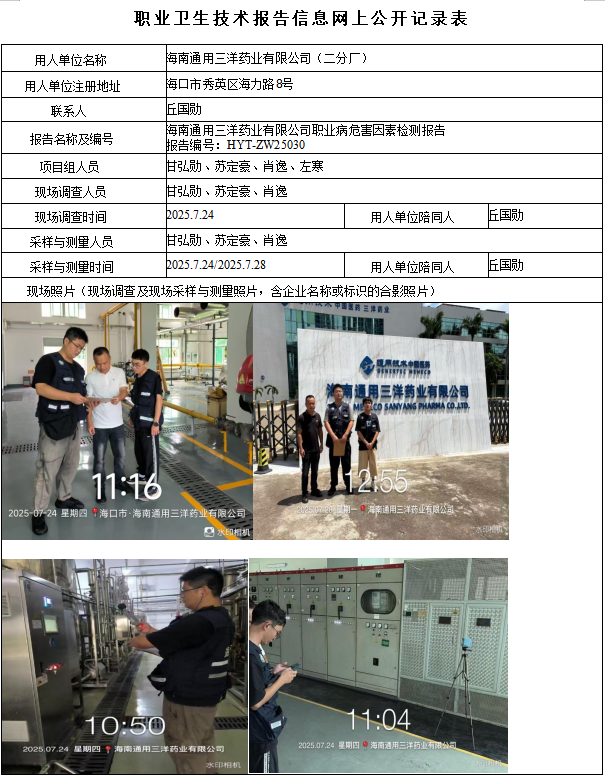 海南通用三洋药业有限公司(二分厂)2025年职业病危害因素定期检测