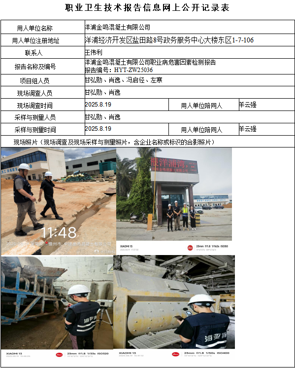 洋浦金鸣混凝土有限公司2025年职业病危害因素定期检测
