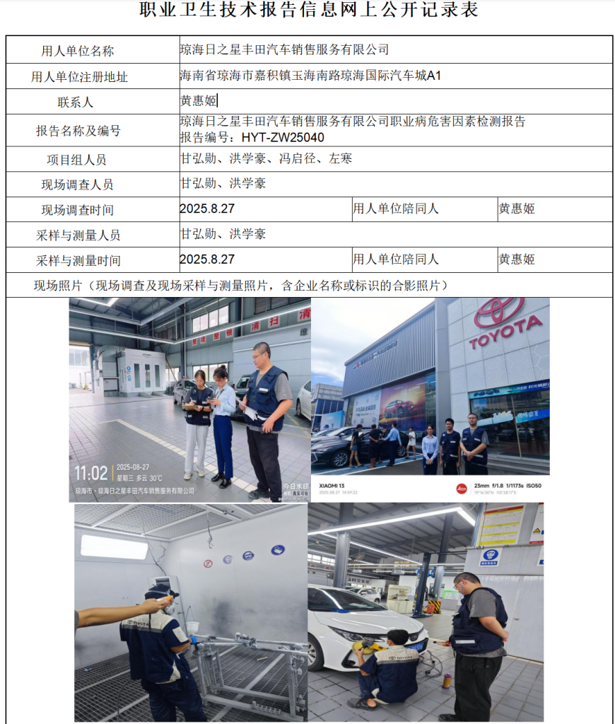 琼海日之星丰田汽车销售服务有限公司2025年职业病危害因素定期检测