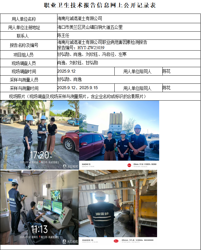 海南兆诚混凝土有限公司2025年职业病危害因素定期检测