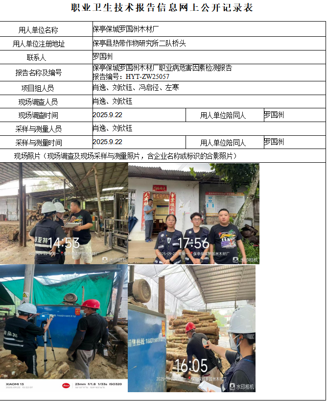 保亭保城罗国洲木材厂2025年职业病 危害因素定期检测