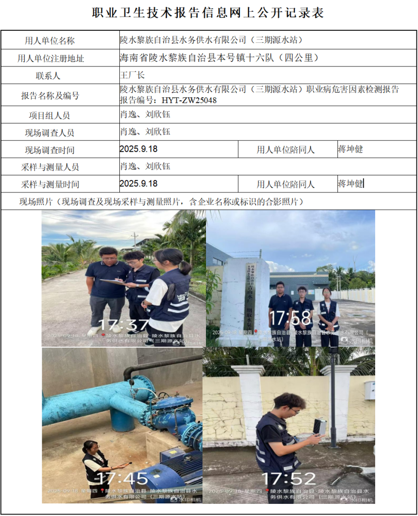 陵水黎族自治县水务供水有限公司(三期源水站)2025年职业病危害因素定期检测