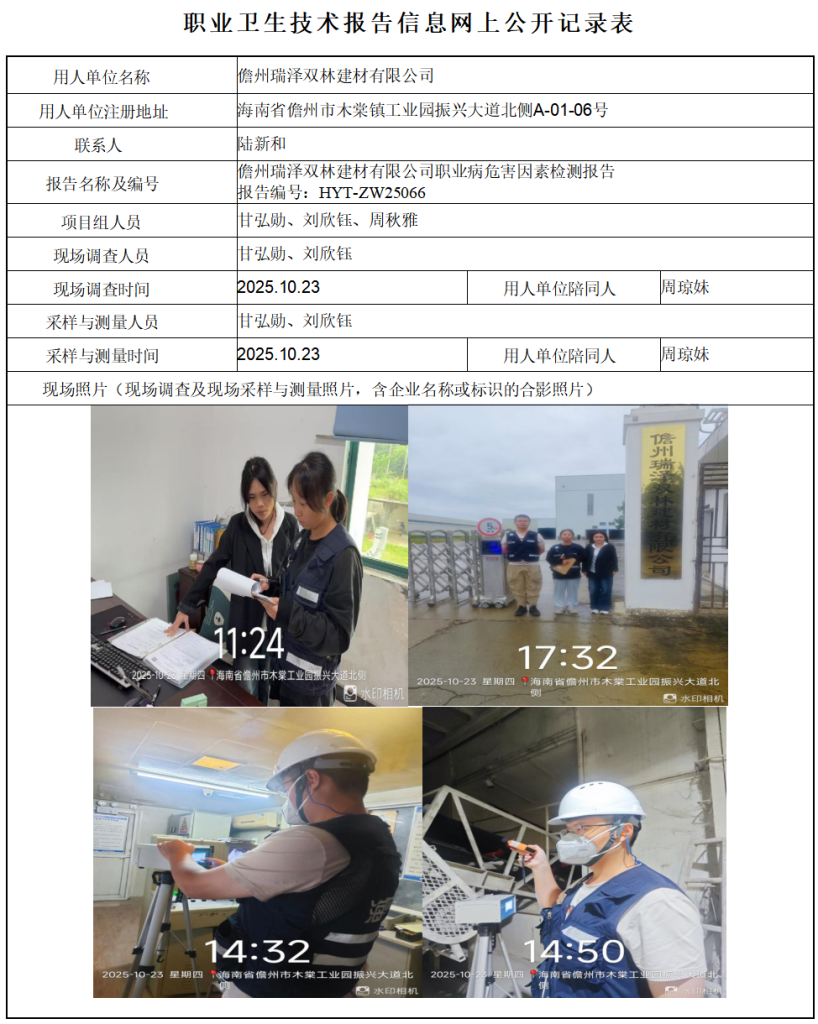 儋州瑞泽双林建材有限公司2025年职业病危害因素定期检测