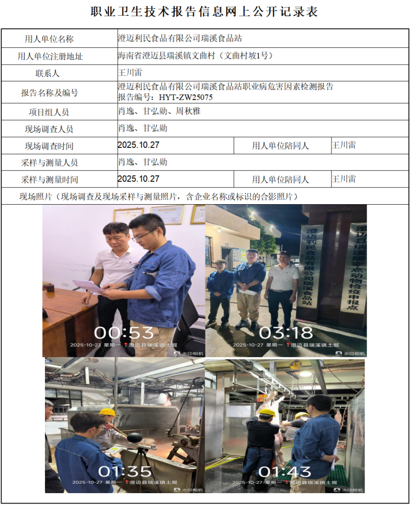 澄迈利民食品有限公司瑞溪食品站2025年职业病危害因素定期检测