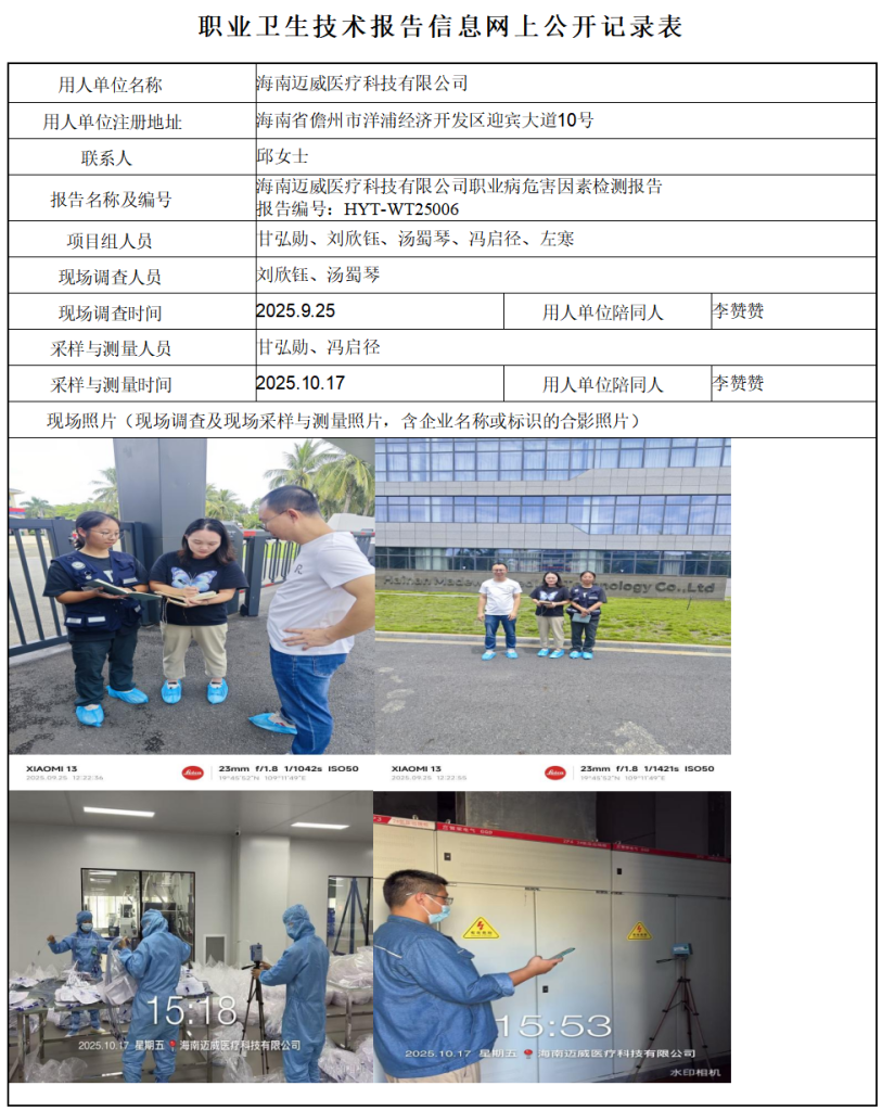 海南迈威医疗科技有限公司2025年职业病危害因素委托检测报告公示