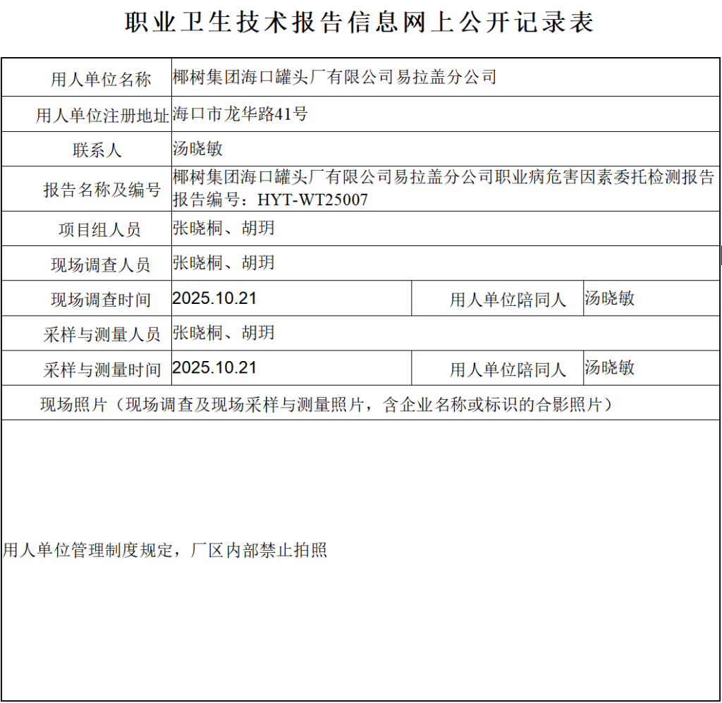 椰树集团海口罐头厂有限公司易拉盖分公司2025年职业病危害因素委托检测报告信息公示