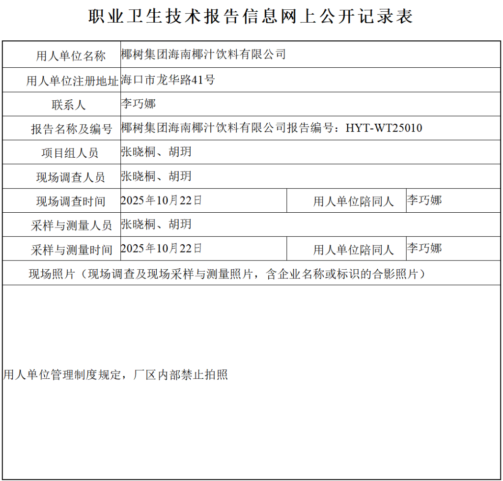 椰树集团海南椰汁饮料有限公司2025年职业病危害因素委托检测报告信息公示