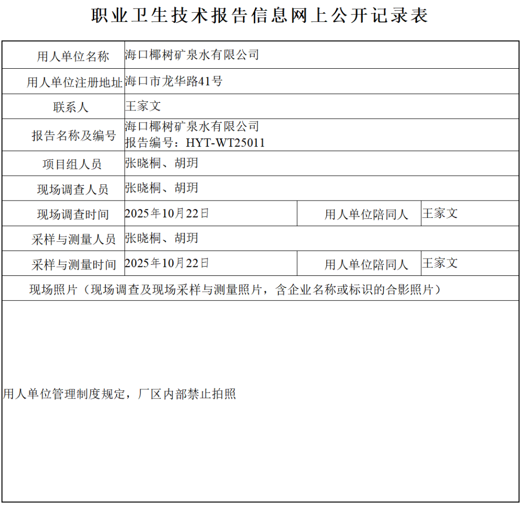 海口椰树矿泉水有限公司2025年职业病危害因素委托检测报告信息公示