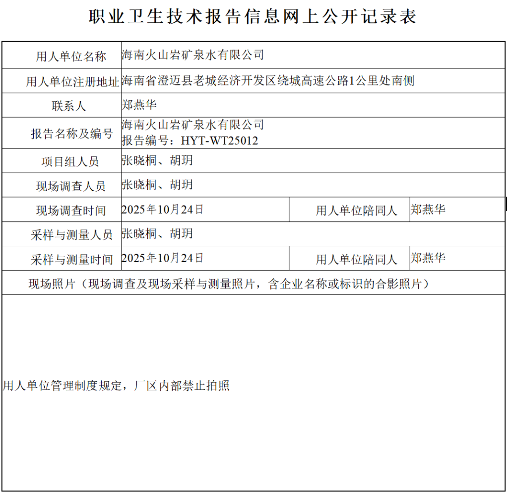 海南火山岩矿泉水有限公司2025年职业病危害因素委托检测报告信息公示
