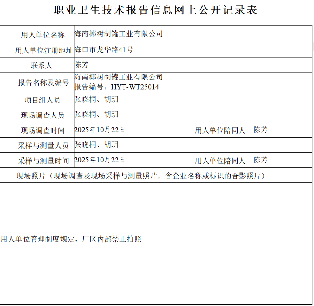 海南椰树制罐工业有限公司2025年职业病危害因素委托检测报告信息公示