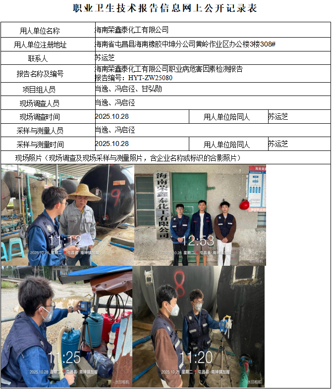 海南荣鑫泰化工有限公司2025年职业病危害因素定期检测报告信息公示