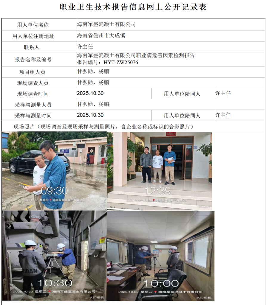 海南军盛混凝土有限公司2025年职业病危害因素定期检测报告信息公示