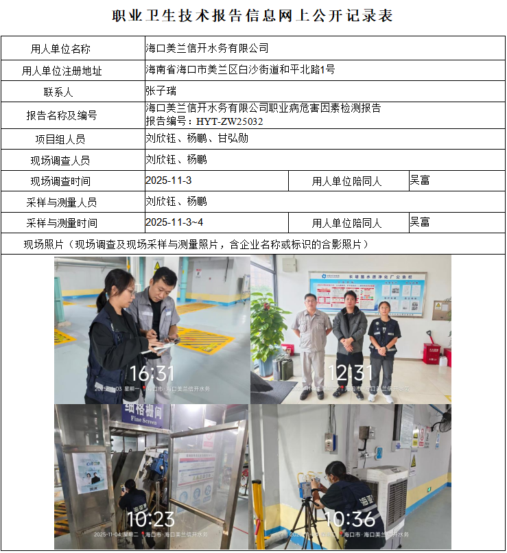 海口美兰信开水务有限公司2025年职业病危害因素定期检测报告信息公示