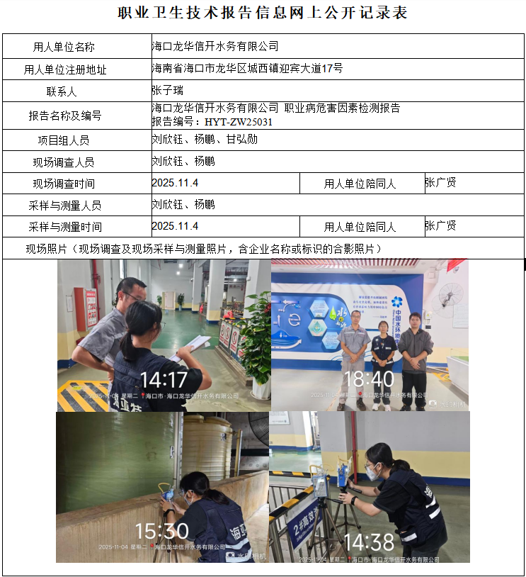 海口龙华信开水务有限公司2025年职业病危害因素定期检测报告信息公示