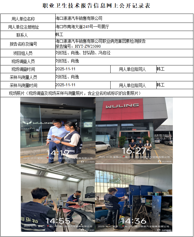海口源源汽车销售有限公司2025年职业病危害因素定期检测报告信息公示