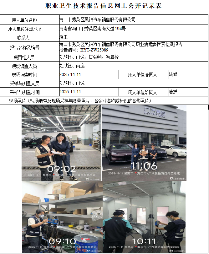 海口市秀英区昊铂汽车销售服务有限公司2025年职业病危害因素定期检测报告信息公示