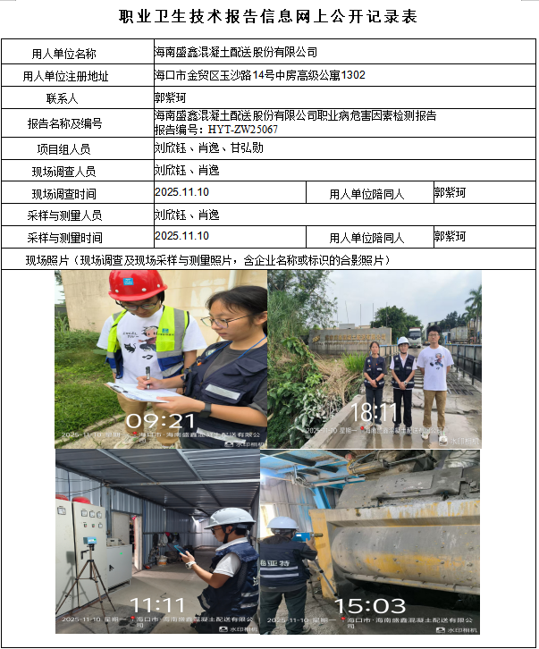 海南盛鑫混凝土配送股份有限公司2025年职业病危害因素定期检测报告信息公示