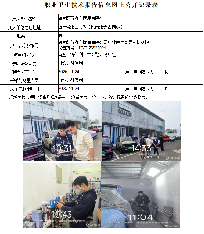 海南蔚蓝汽车管理有限公司2025年职业病危害因素定期检测报告信息公示