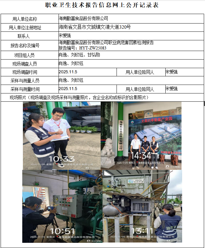 海南勤富食品股份有限公司2025年职业病危害因素定期检测报告信息公示
