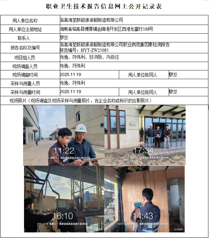 临高海荃新能源游艇制造有限公司2025年职业病危害因素定期检测报告信息公示