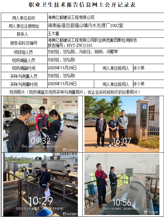 海南亿都建设工程有限公司2025年职业病危害因素定期检测报告信息公示