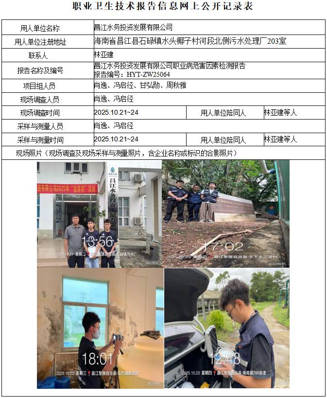 昌江水务投资发展有限公司2025年职业病危害因素定期检测信息公示