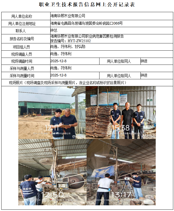 海南华熙木业有限公司2025年职业病危害因素定期检测信息公示