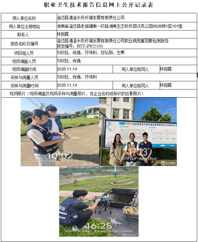 澄迈县清澄水务环境发展有限责任公司(2号污水泵站)2025年职业病危害因素定期检测报告信息公示