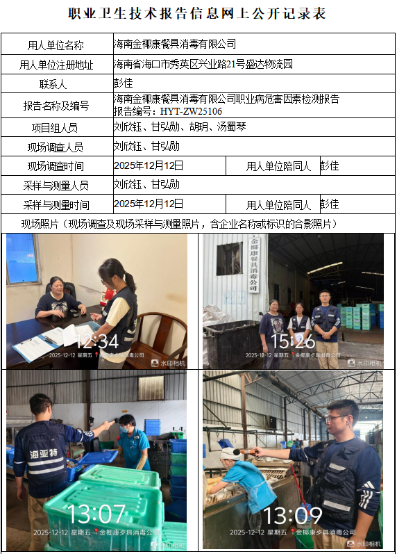 海南金椰康餐具消毒有限公司2025年职业病危害因素定期检测报告信息公示