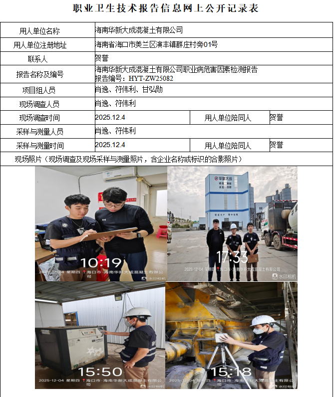 海南华新大成混凝土有限公司2025年职业病危害因素定期检测报告信息公开