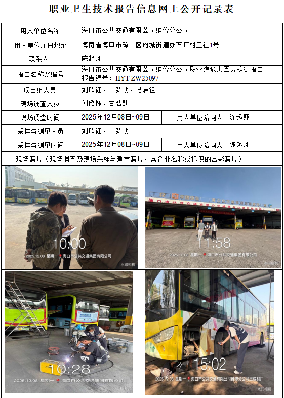 海口市公共交通有限公司维修分公司2025年职业病危害因素定期检测报告信息公开