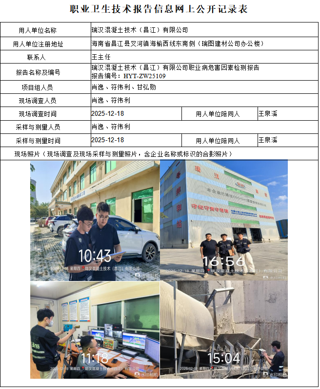 瑞汉混凝土技术(昌江)有限公司2025年职业病危害因素定期检测报告信息公示