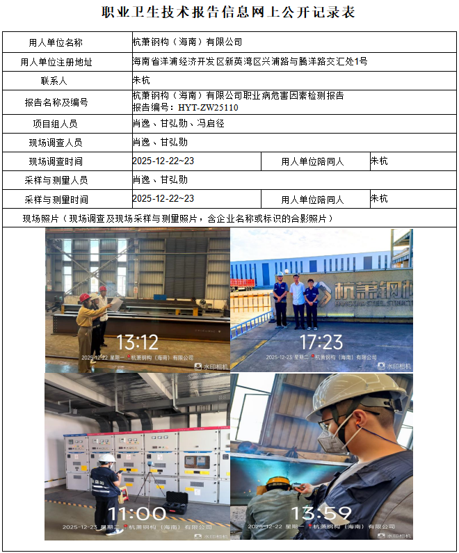 杭萧钢构(海南)有限公司2025年职业病危害因素定期检测报告信息公示