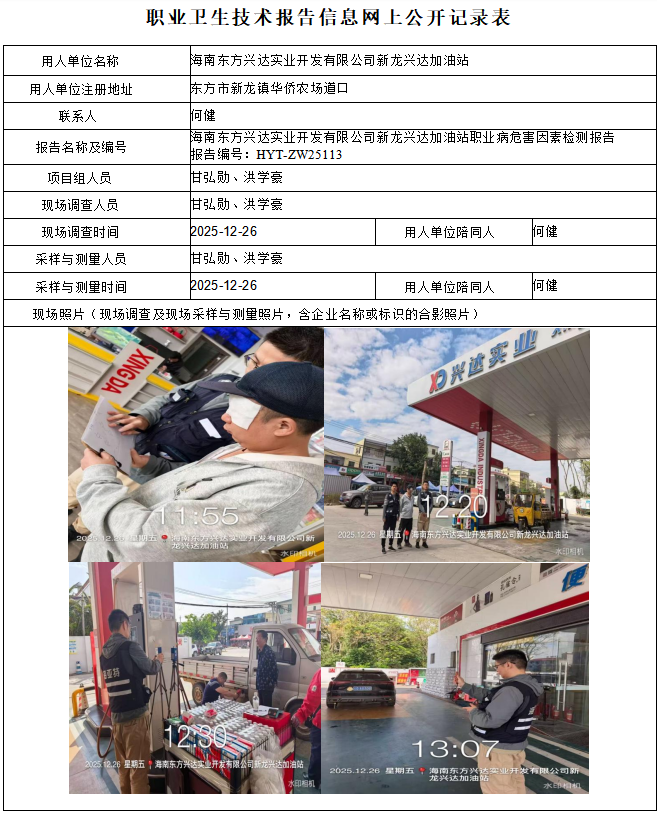 海南东方兴达实业开发有限公司新龙兴达加油站2025年职业病危害因素定期检测报告信息公示