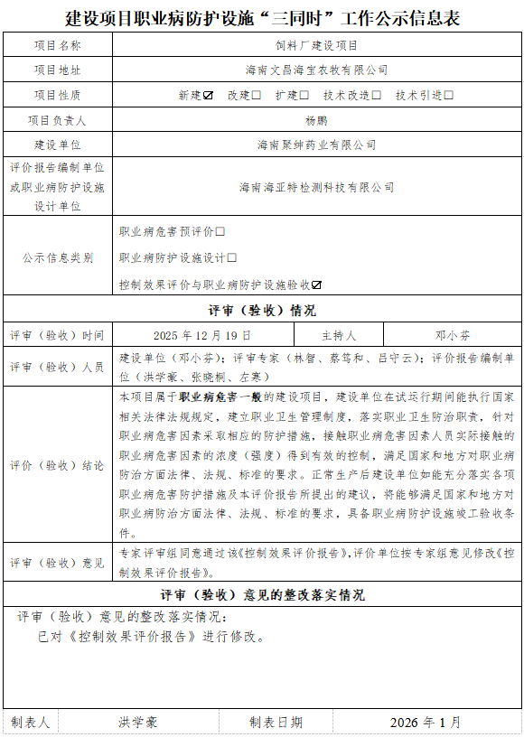 海南文昌海宝农牧有限公司饲料厂建设项目职业病危害控制效果评价工作公示信息表