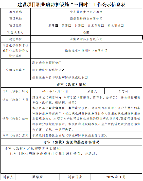 海南聚绅药业有限公司中成药研发及生产项目职业病防护设施设计专篇工作公示信息表