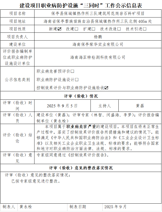保亭县保城镇热作所三队建筑用花岗岩石料矿项目职业病防护设施设计专篇工作公示信息表