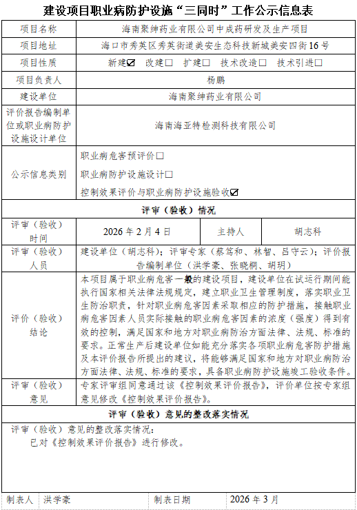 海南聚绅药业有限公司中成药研发及生产项目职业病防护设施“三同时”工作公示信息表