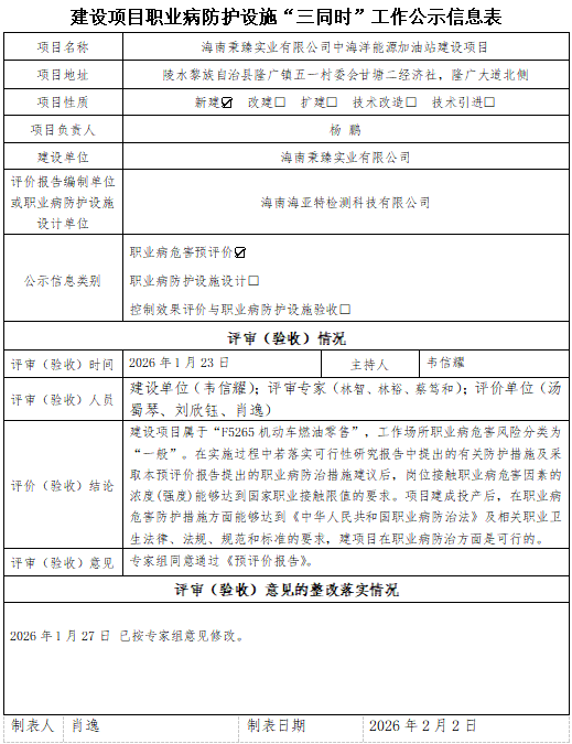 海南秉臻实业有限公司中海洋能源加油站建设项目职业病防护设施“三同时”工作公示信息表